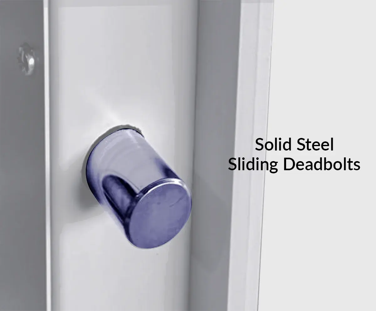 - Glissière de verrous en acier massif coulissent pour sécuriser la porte en place et la protéger contre les tentatives d’intrusion